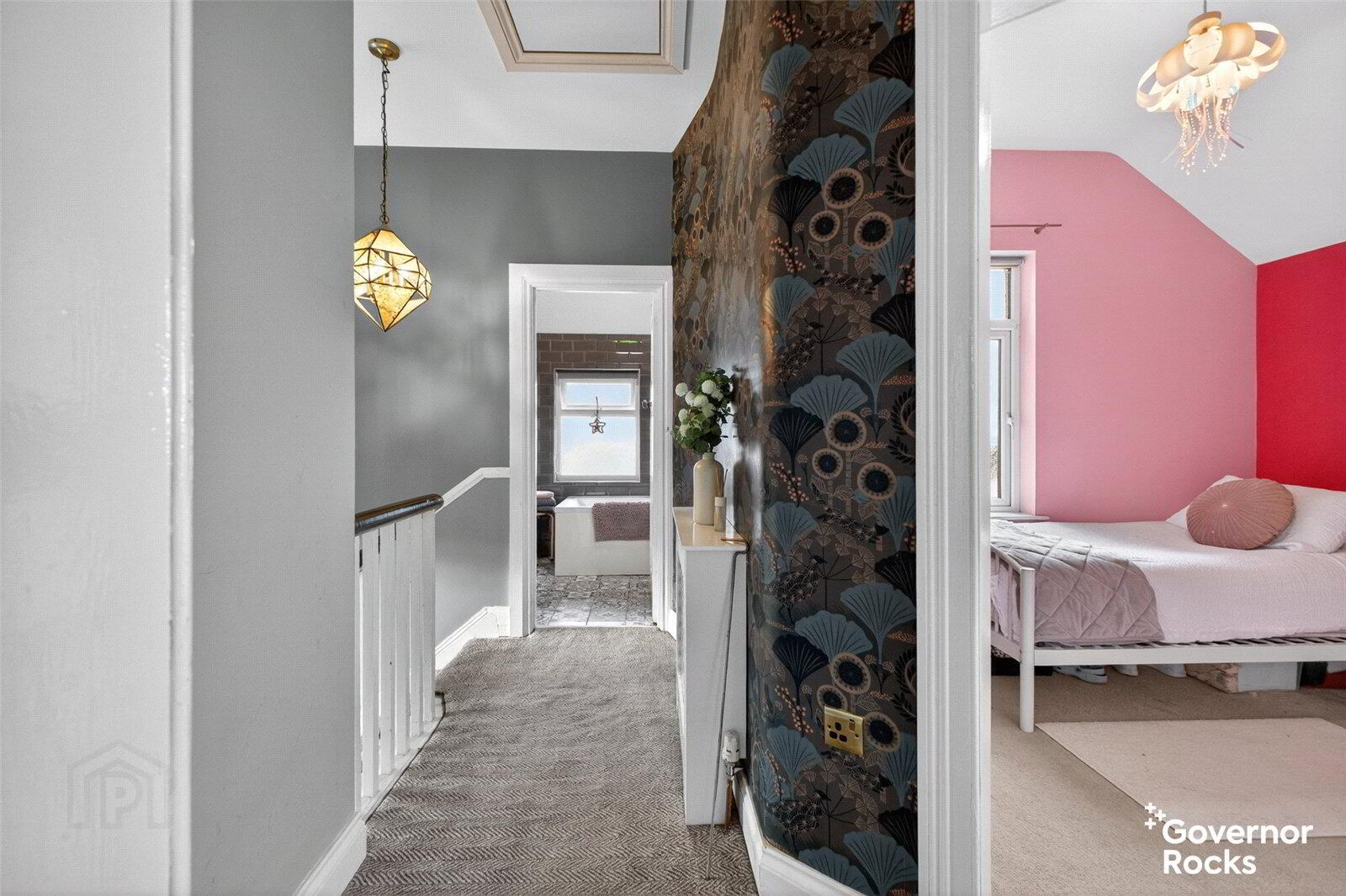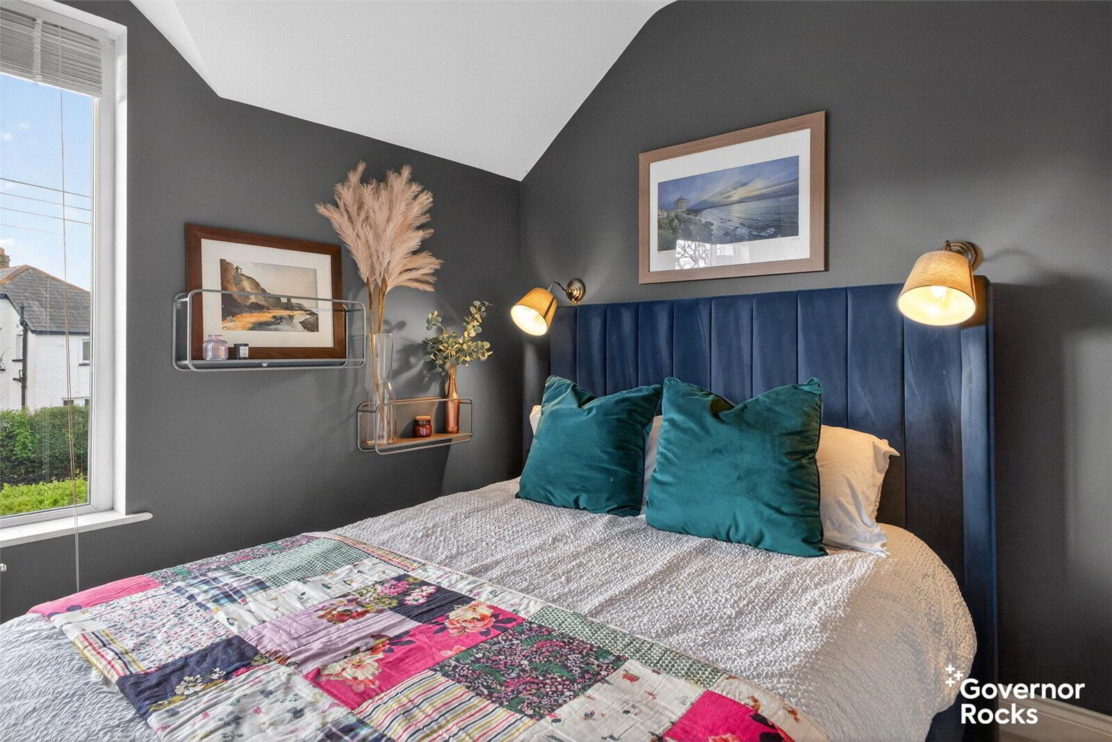 Upstairs there is a recently refurbished bathroom with a mains shower over a P bath, vanity cupboard & sink, wall radiator and period style tile flooring. The 2 smaller bedrooms are at the rear of the property- one of which benefits from a sea view. The master is at the front of the property with build in wardrobes – perfect for displaying calm and order and aiding a peaceful retreat.