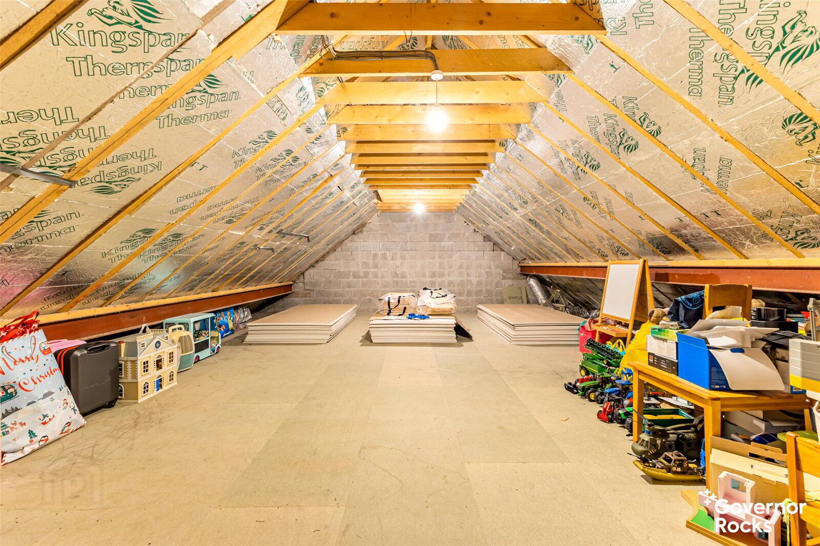 The accommodation includes three well-proportioned double bedrooms. The principal bedroom benefits from a stylish, recently refurbished en-suite shower room, while the remaining bedrooms are served by a traditional bathroom fitted with a three-piece suite. From the hallway, stairs lead to the loft which currently provides two very large loft rooms and an excellent storage cupboard, offering clear potential for conversion to additional living or sleeping accommodation (subject to the necessary planning and building control approvals).
