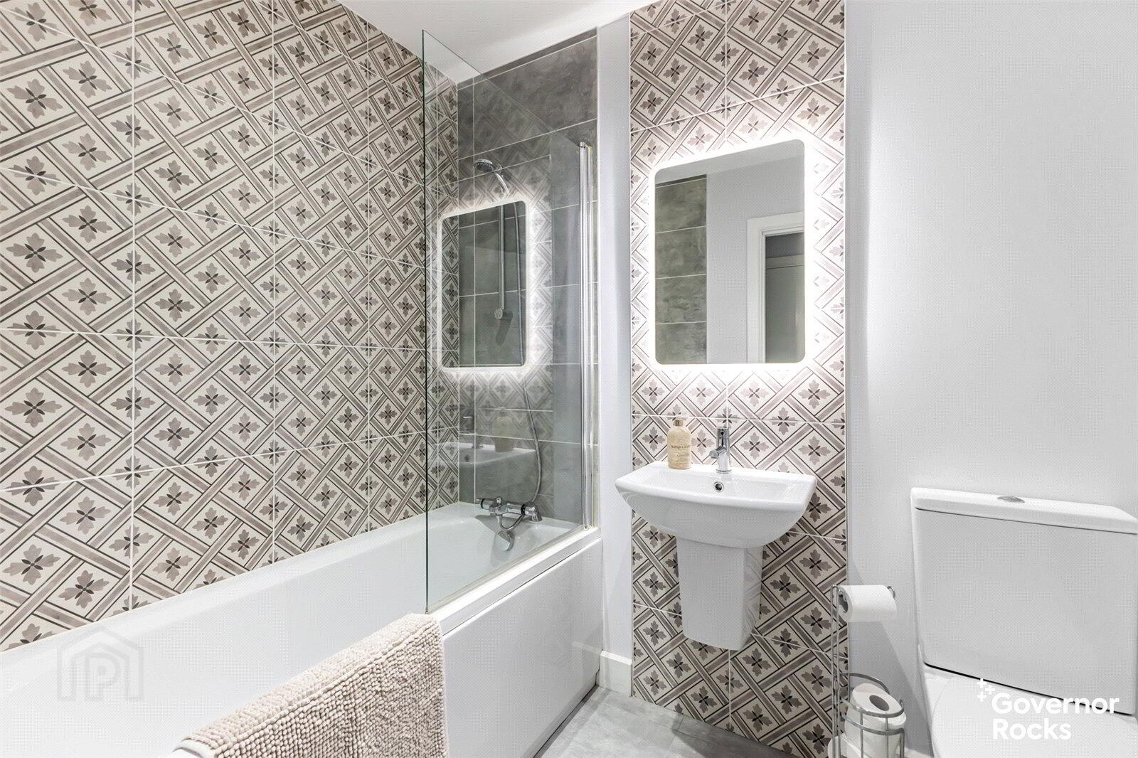 A modern family bathroom completes the floor, featuring a three piece suite, overhead shower and striking mediterranean trellis effect tiles.