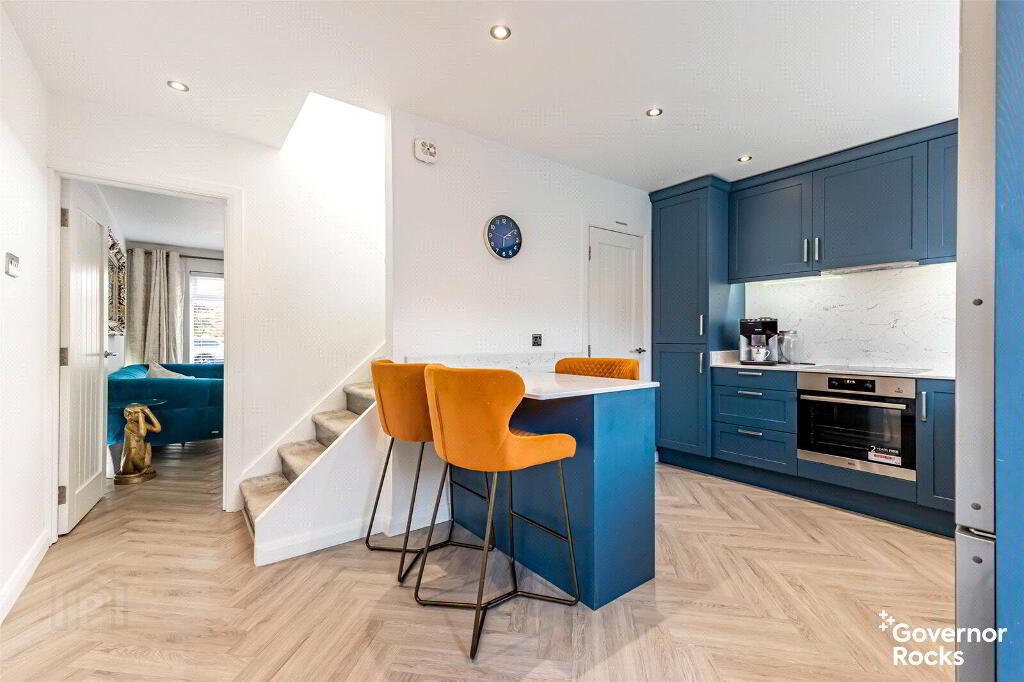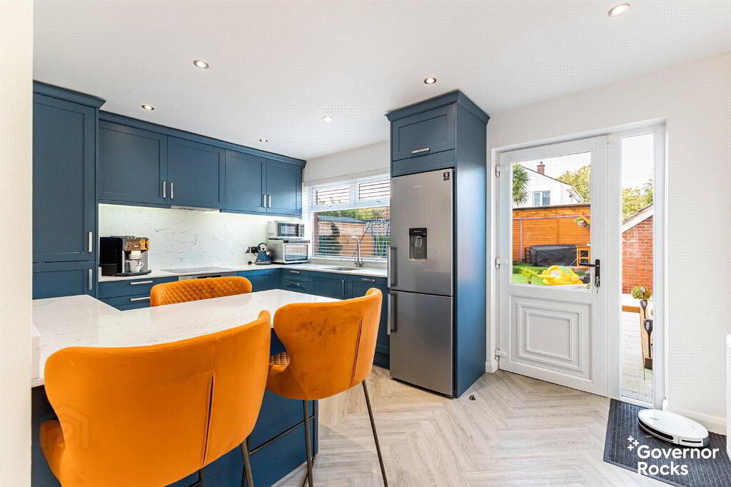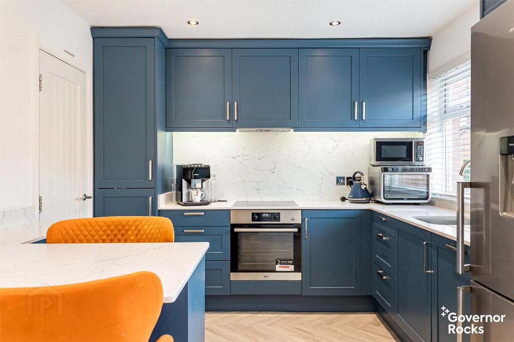 At the rear, the kitchen is nothing short of exceptional. Recently fitted in a striking ‘Hague Blue’ finish, the cabinetry contrasts elegantly with marble-effect worktops and flooring, creating a look that is both stylish and timeless. A central peninsula island not only adds valuable storage but also forms a natural gathering point, perfect for casual dining, morning coffee, or entertaining friends.