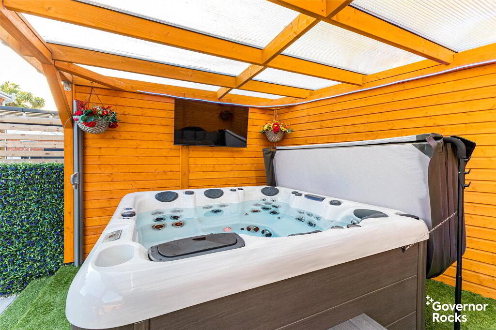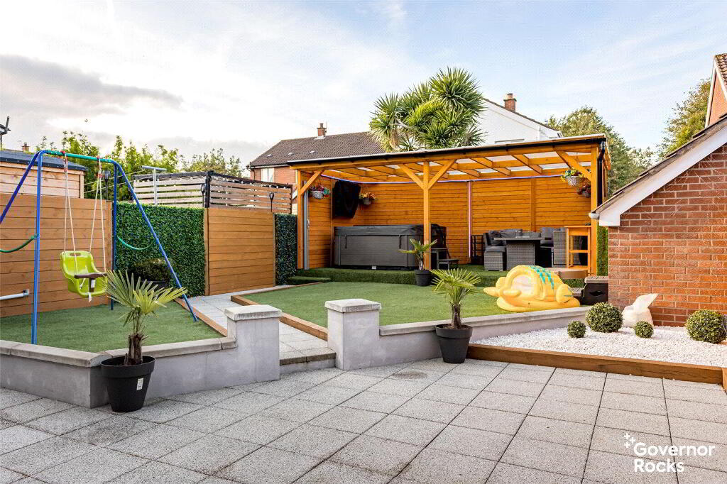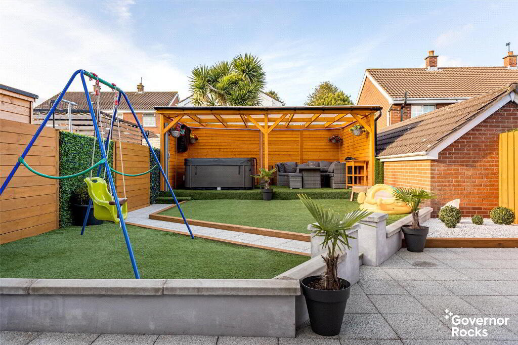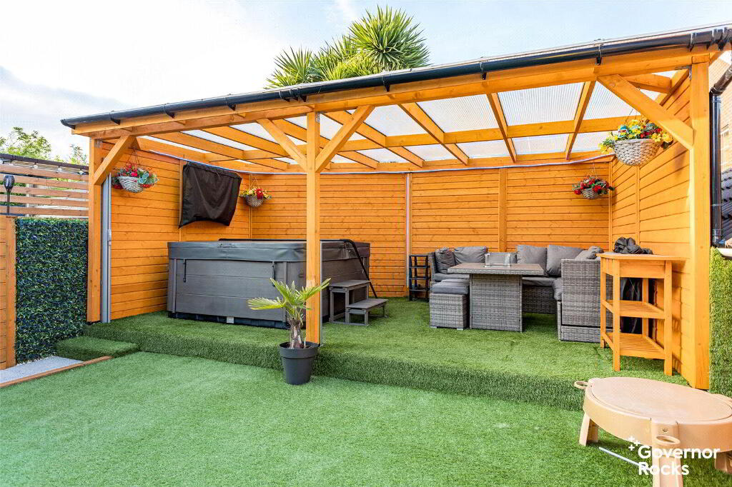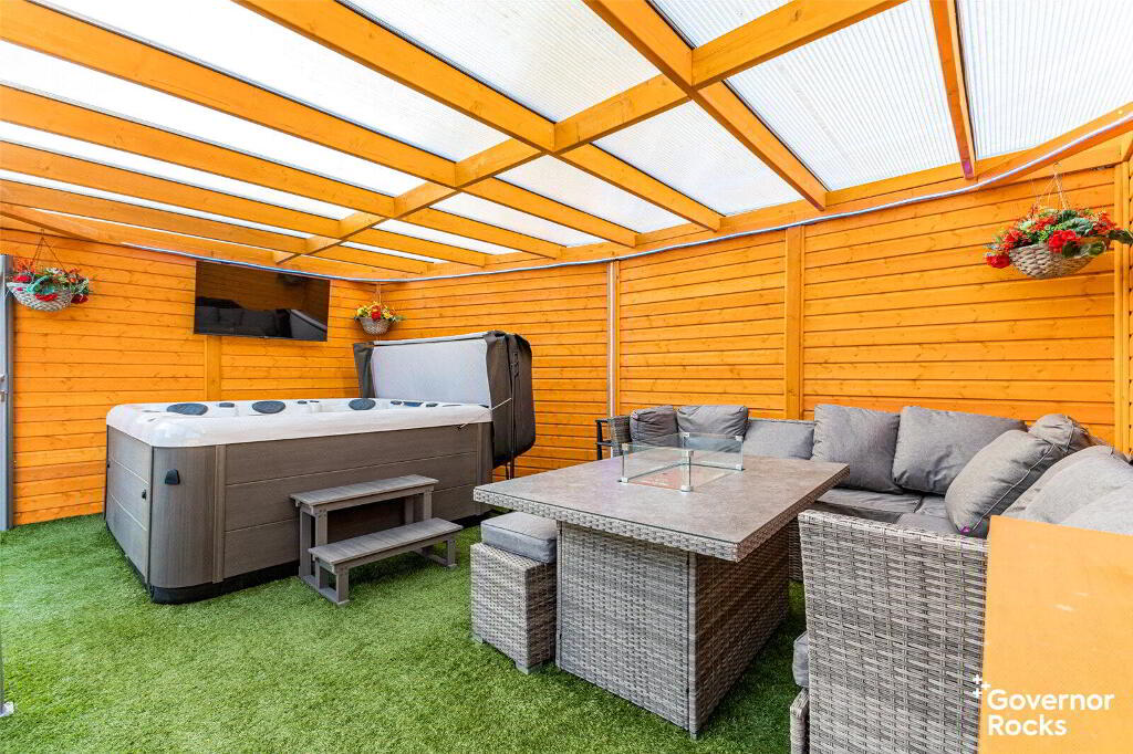 The sense of quality and thoughtfulness continues outdoors, where the landscaped rear garden has been designed with relaxation and enjoyment in mind. A large patio and easy-maintenance faux lawn lead to a raised deck, complete with power supply, where a hot tub and garden furniture create the perfect setting for summer evenings. With the addition of a mounted television, this unique outdoor space promises unforgettable nights of entertainment and indulgence.