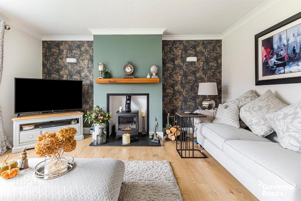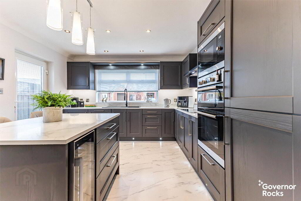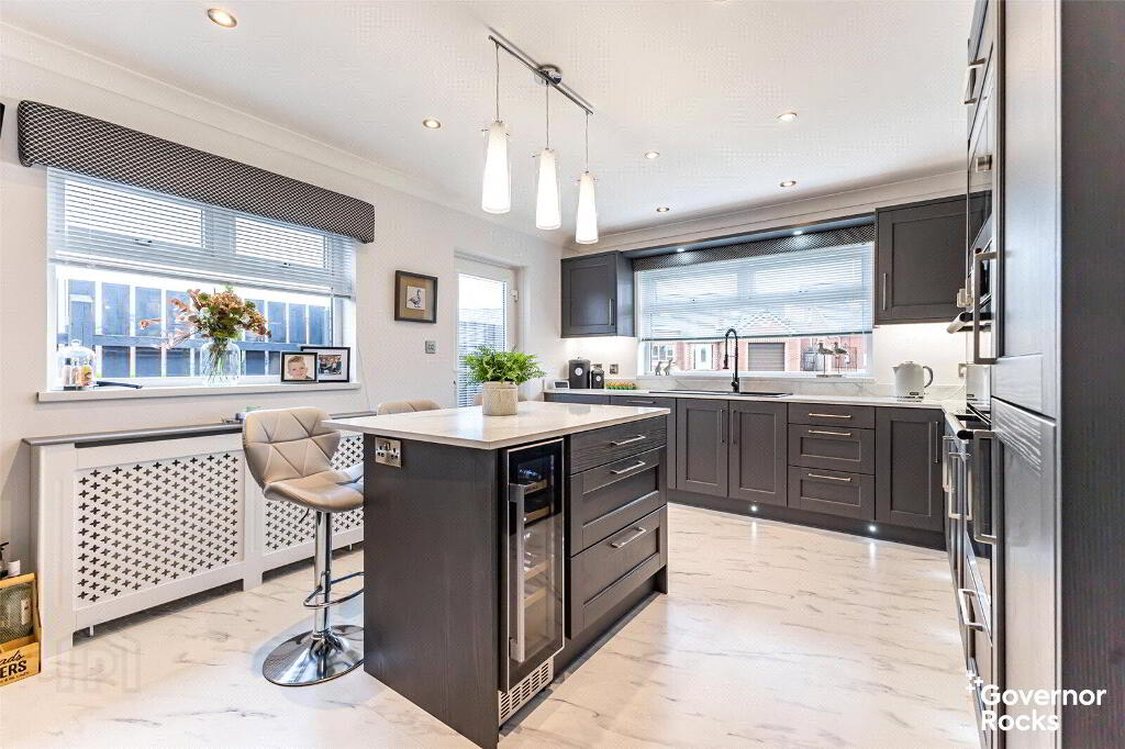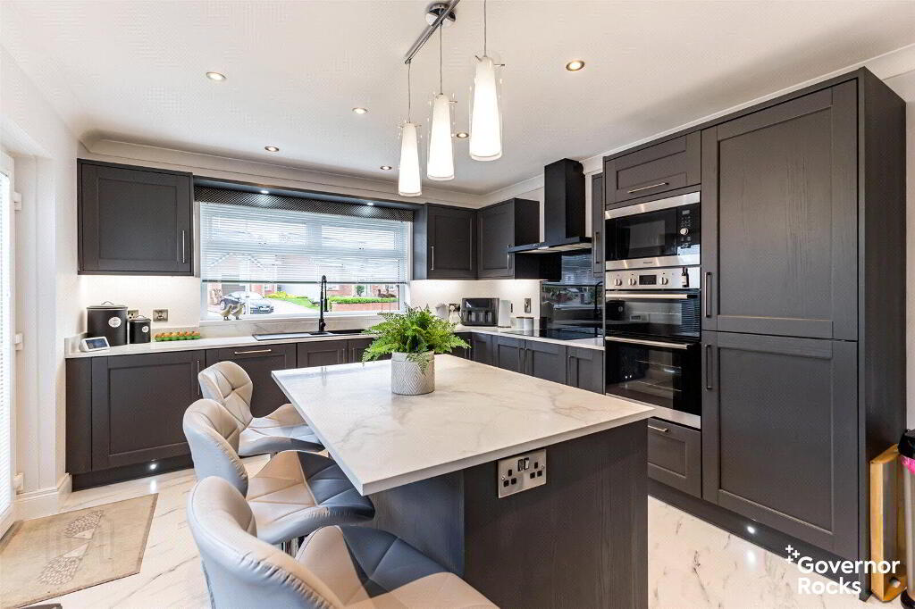 The main lounge is both elegant and welcoming, offering the perfect canvas for a variety of furniture arrangements. At its heart lies a beautiful wood-burning stove, setting the tone for cosy evenings and memorable gatherings. The kitchen, newly fitted in 2024, is nothing short of striking. With rich anthracite cabinetry, marble-effect worktops and a stylish central island, it is both a chef’s dream and an entertainer’s delight.