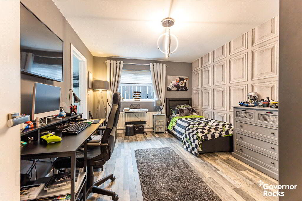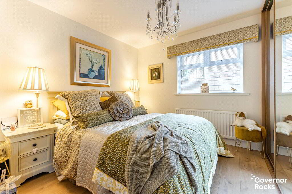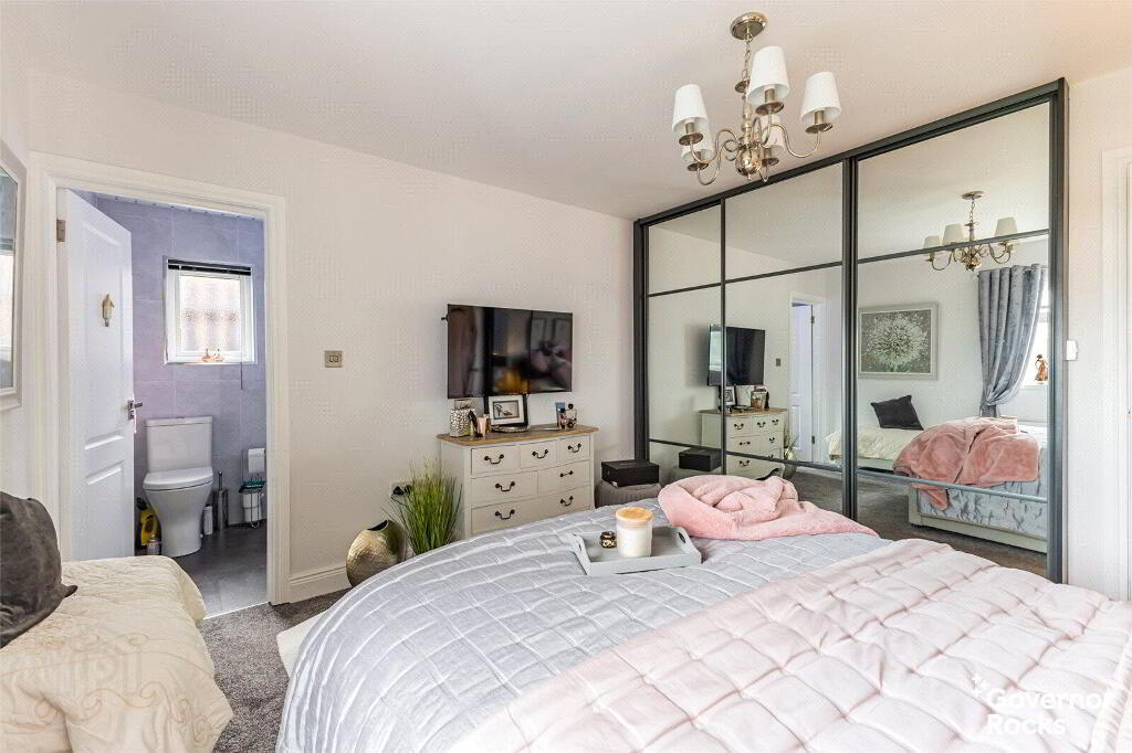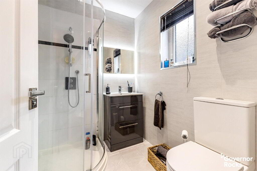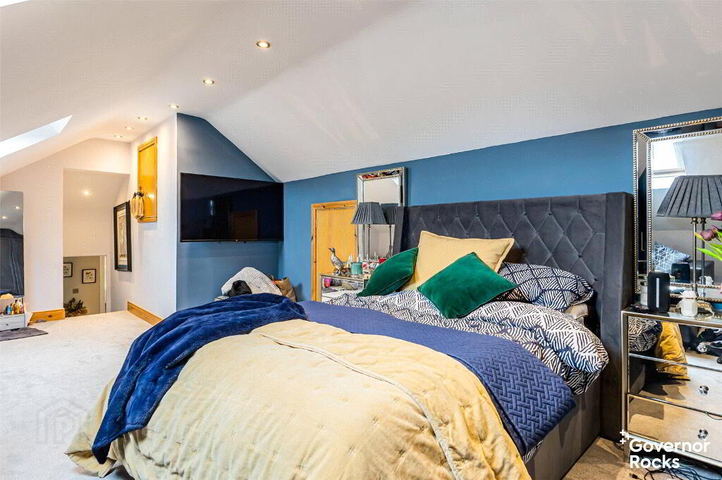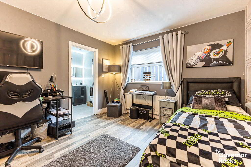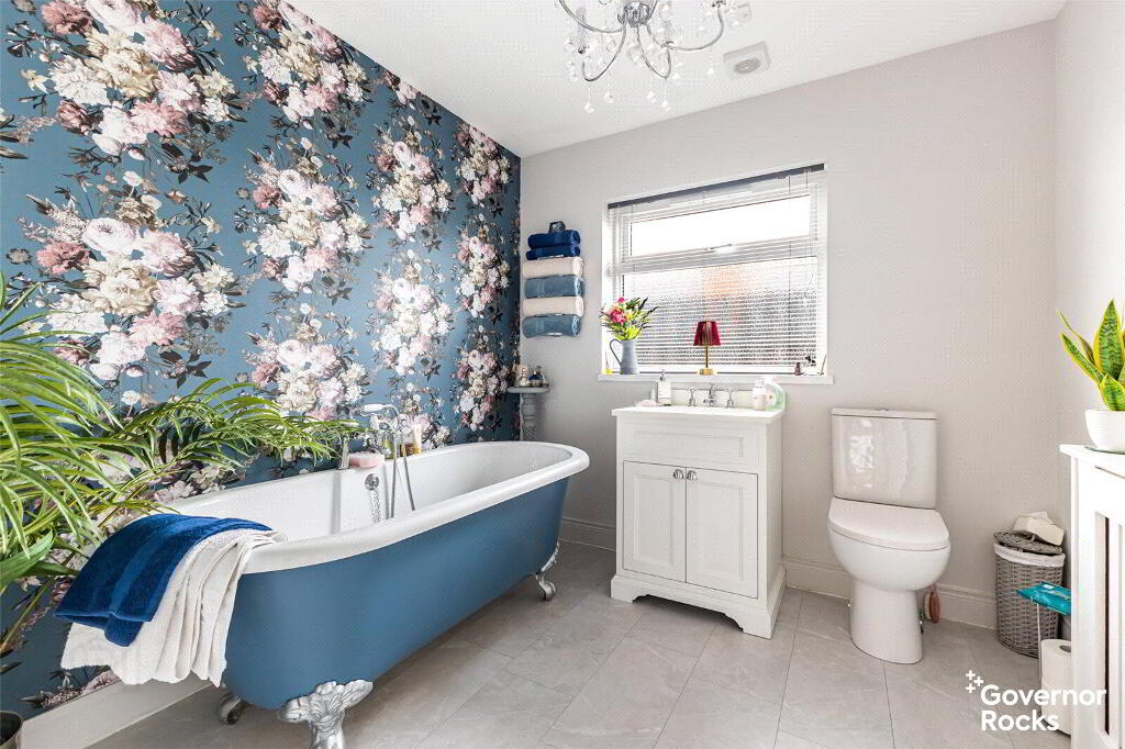 The luxurious ground floor bathroom is a sanctuary in its own right, complete with a roll-top bath, vanity unit and contemporary finishes, while a short staircase leads down to the versatile lower ground floor. Here you will find four well-proportioned double bedrooms, two of which enjoy the privacy of modern en-suite bathrooms, with the forth bedroom having direct access to the conservatory. This space flows seamlessly into a large conservatory, where natural light pours in and views stretch out over the rooftops towards the water tower—a perfect spot to unwind or entertain with effortless connection to the rear garden.