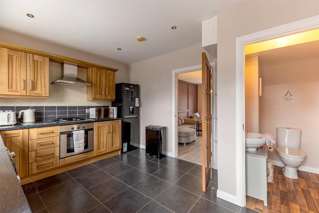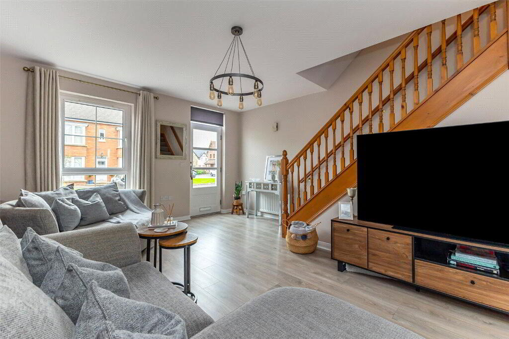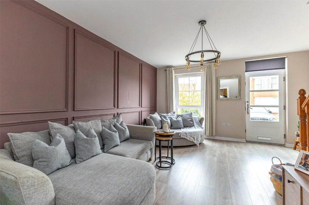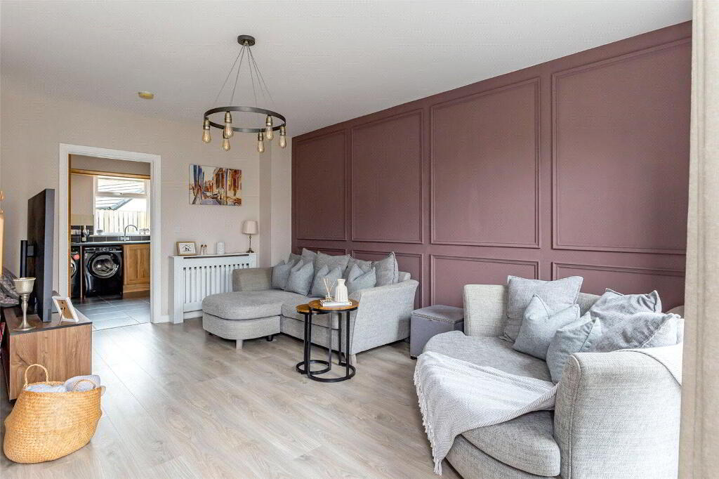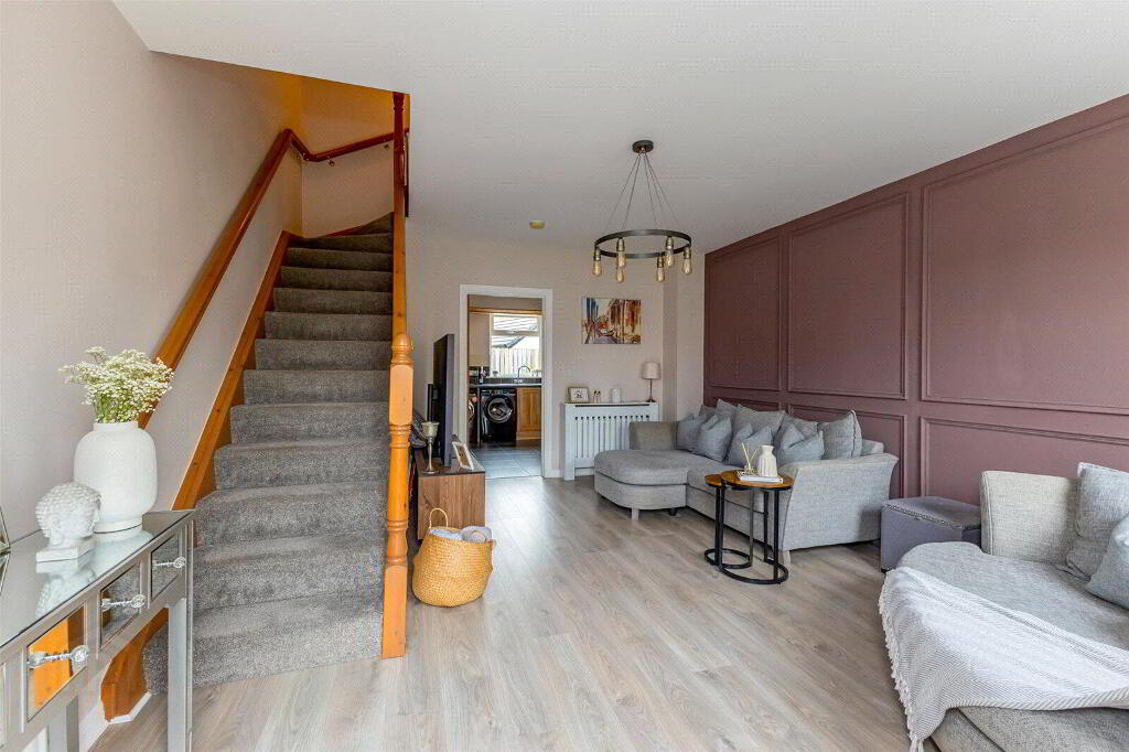 This home boasts several residents parking spaces as you arrive. Loads of kerb appeal and a great site with landscaped gardens in front of the house. Upon entry, the lounge is filled with light and also boasts a feature panelled wall, all painted in modern colours and to an exacting standard. Off the rear of the lounge sits the kitchen/diner. This room boasts fitted high and low units, and loads of space for a dining table and a second sofa if required. A glazed door opens onto the very private and fenced rear garden.