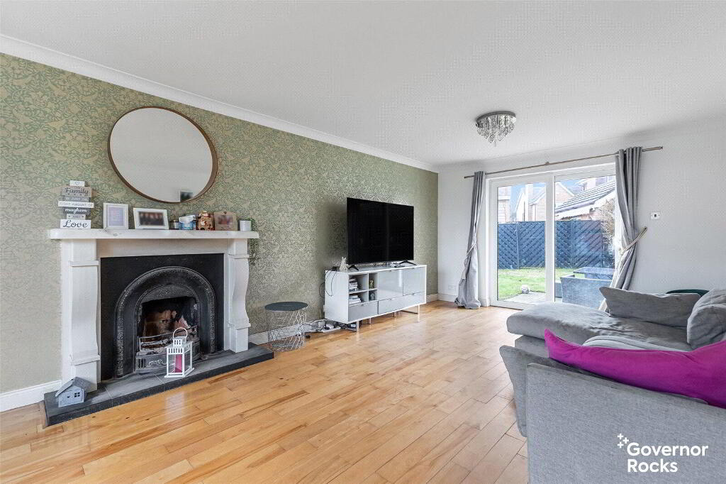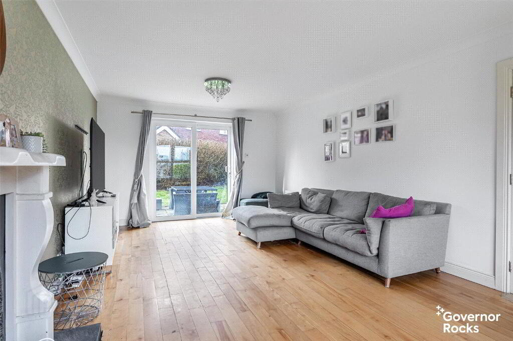 The exceptionally spacious lounge offers flexibility for various furniture layouts and features a cosy open fire with decorative surround. A glazed sliding door opens directly onto the rear garden, seamlessly connecting indoor and outdoor living.
