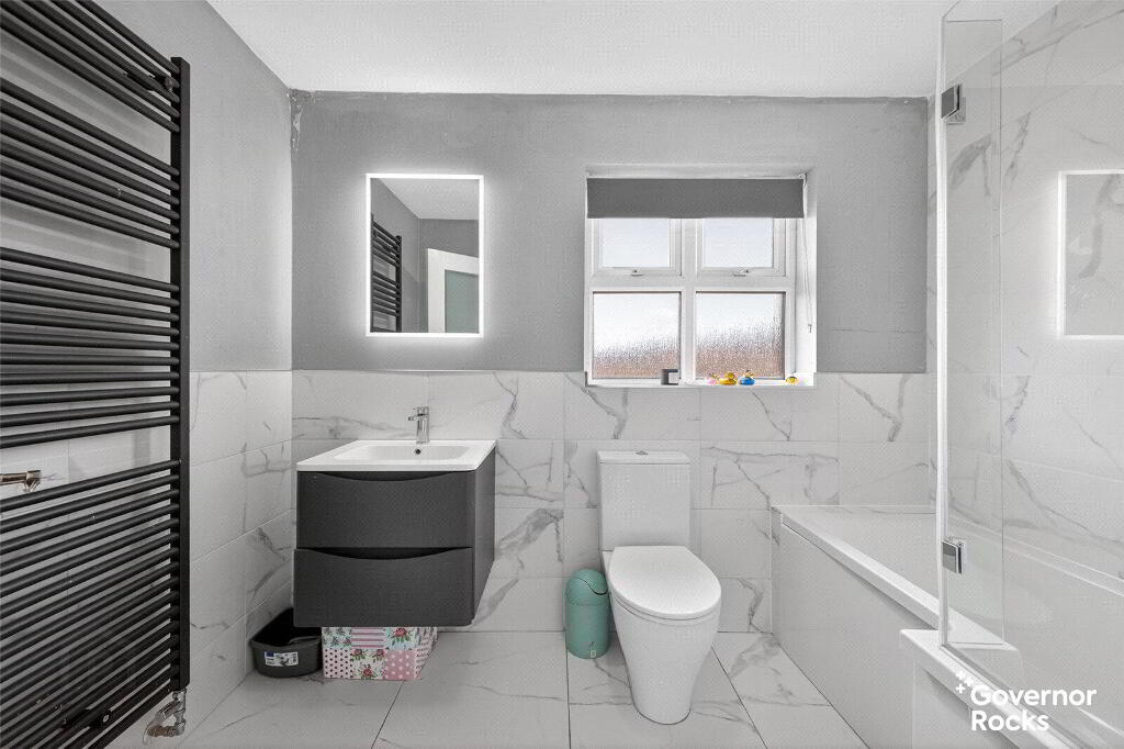 A contemporary family bathroom serves the household, complete with a modern white suite and a stylish ‘P’-shaped bath with shower over.