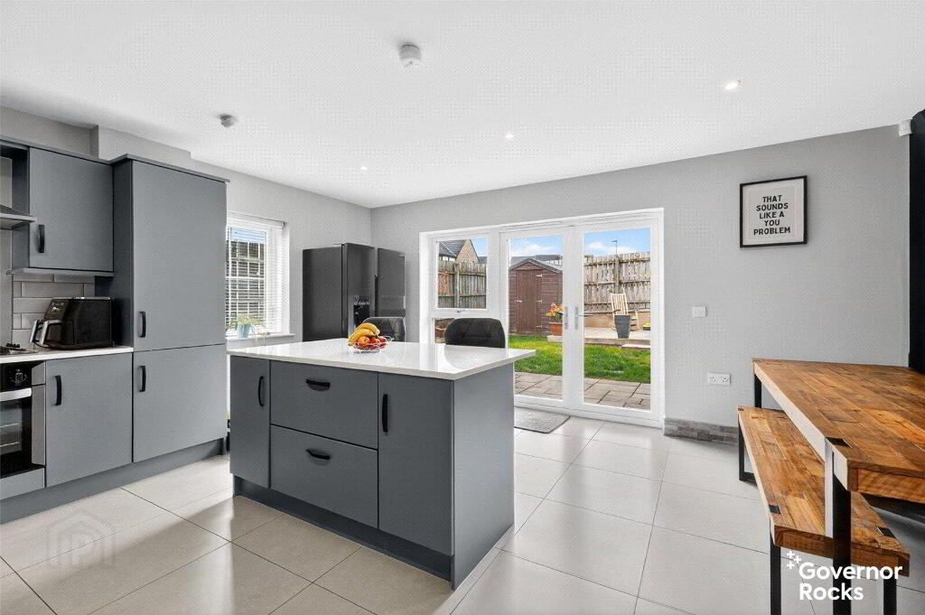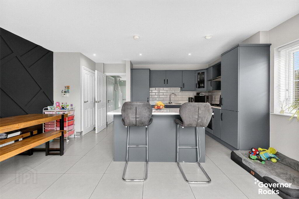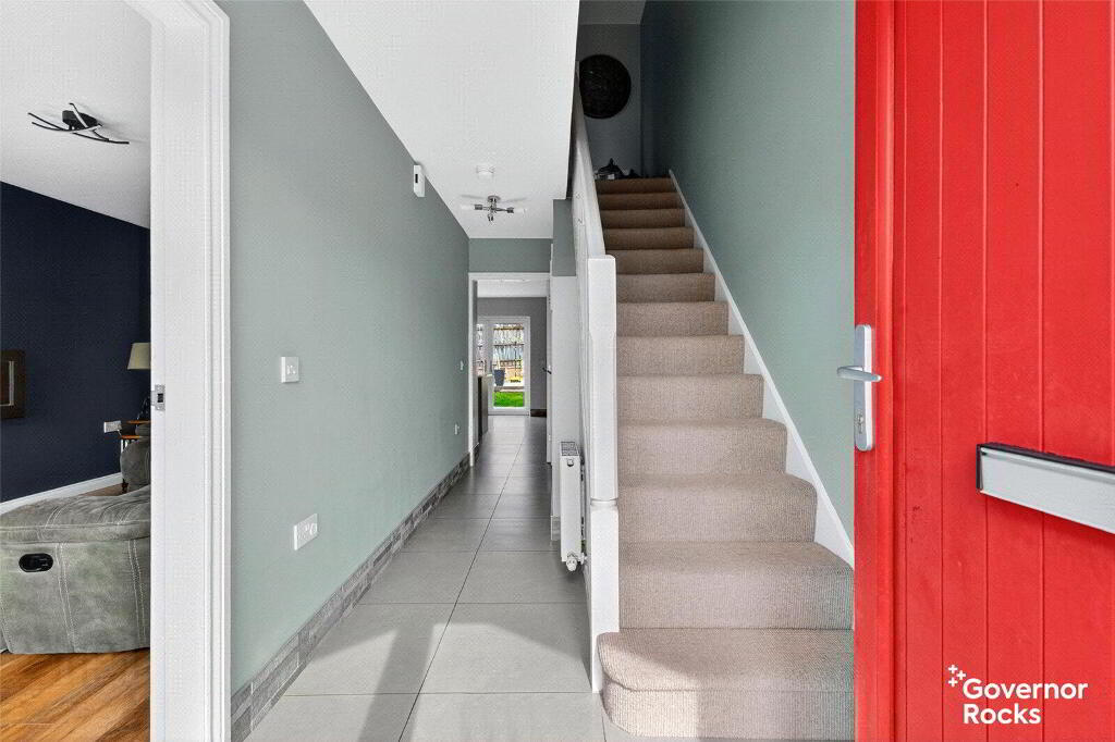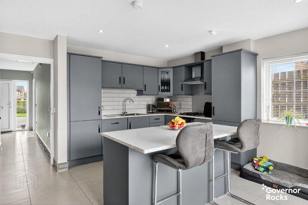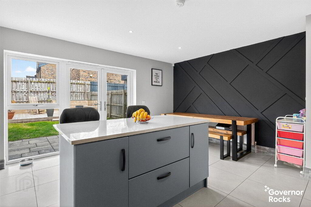 Stepping inside, the bright and welcoming hallway creates a warm and inviting first impression. The separate lounge offers a superb living space, benefitting from dual aspect windows that flood the room with natural light while also providing a high level of privacy. To the rear, the spacious kitchen and dining area serves as the heart of the home, featuring a stylish range of modern high and low level units, a central island, and ample space for family dining. French doors open directly onto the garden, seamlessly connecting indoor and outdoor living. A practical laundry cupboard accommodates a washing machine and tumble dryer, while a convenient downstairs cloakroom fitted with a WC and wash hand basin is tucked neatly under the stairs.