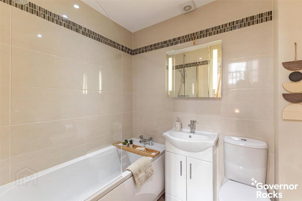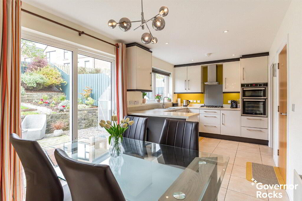 Ascending a few steps to the first floor, you’re greeted by a bright and spacious open-plan kitchen-diner that’s perfect for family gatherings and entertaining. The kitchen features a practical peninsula island with ample worktop space and a range of high and low shaker-style cabinets, adding both style and functionality. The dining area, with room for a sizable table, opens onto the garden and patio through glazed sliding doors, bringing the outside in. Off the kitchen, a well-appointed utility room provides additional storage, a fridge, freezer, and plumbing for a washing machine.